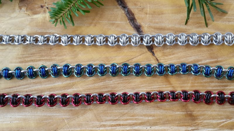 Anodized aluminum 18 gauge rings woven in the pattern called Barrels. Aluminum is very light weight and durable for a long lasting bracelet that can be worn in a variety of conditions.
