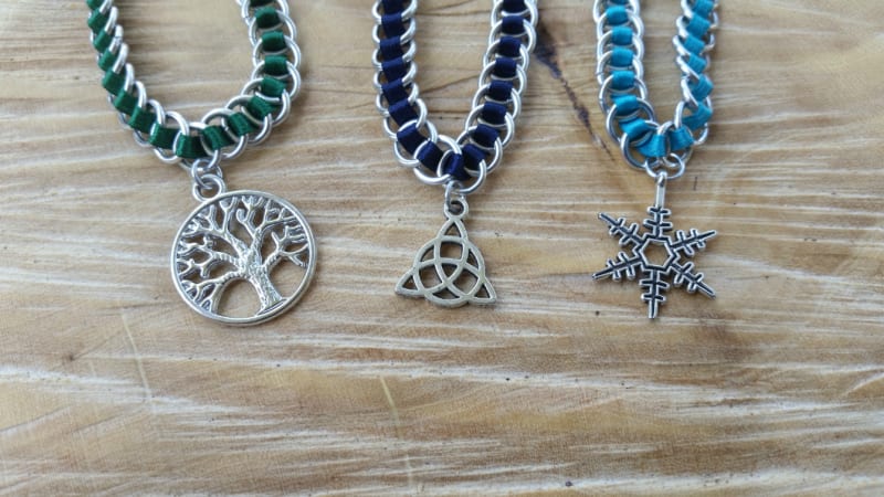 This fun little pattern is called Ribbon Mail and is made from closed rings connected by a ribbon woven through them. The rings are 18 gauge aluminum and the ribbon is 1/8 inch polyester. The length is about 14 inches of woven rings with excess ribbon so that it can be adjusted from choker to longer lengths. For these necklaces, you can choose from a variety of ribbon colors and a charm or crystal accent, and the rings will be the silver color of aluminum. If you would like to request a custom color combination, length, or charm, please feel free to contact me and I will let you know what I have available or what I can do.
